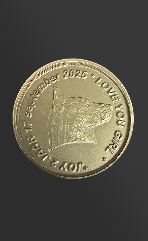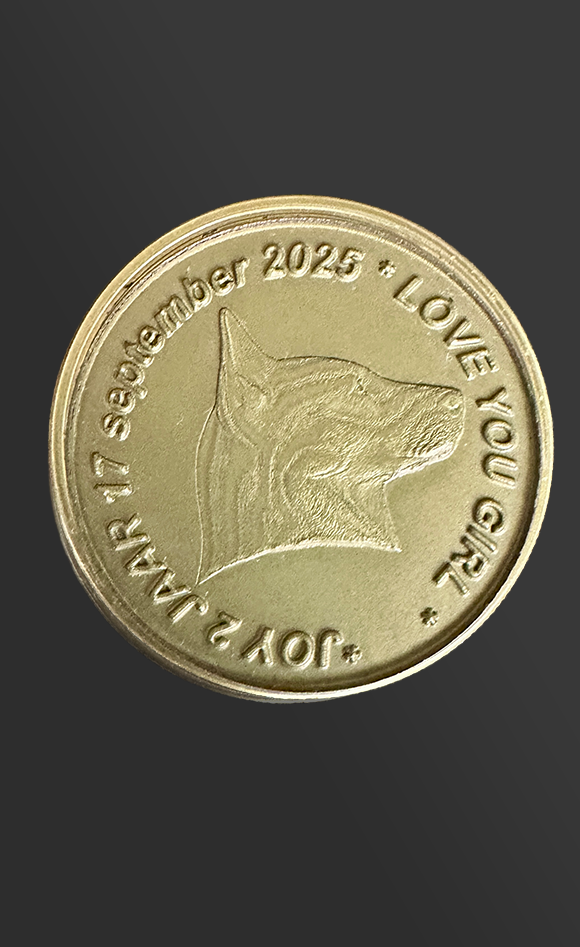 Massief messing munt met relief van honden ras. Rondom naam en data ter herinnering of jubileum munt.
