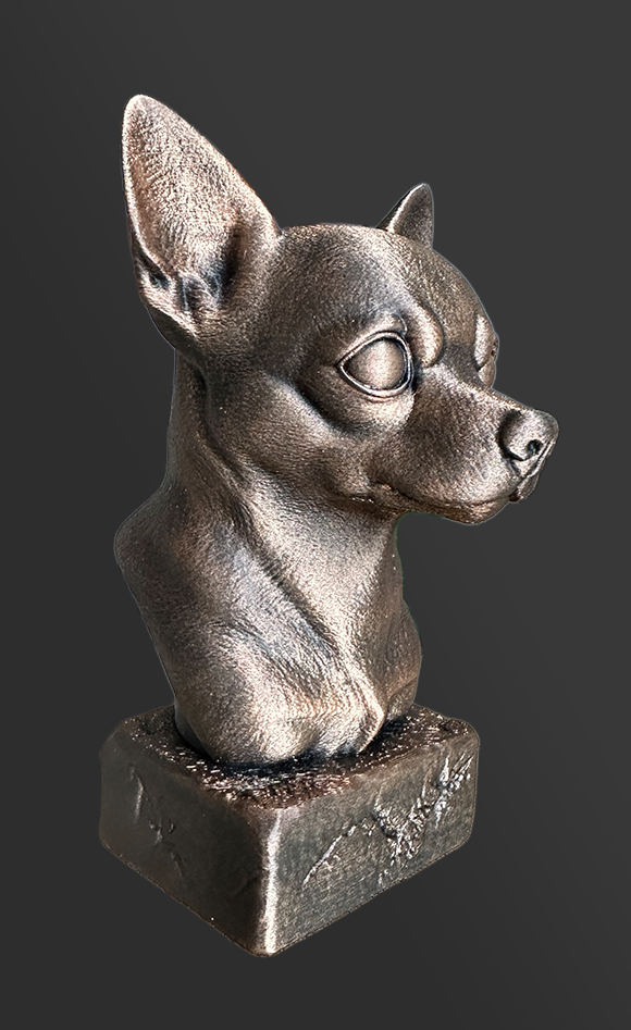 Chihuahua beeldje verbronsd, hoogte 15 cm. Elk beeld wordt met zorg en aandacht individueel vervaardigd. Kleine variaties in oppervlak horen bij het ambachtelijke karakter en maken ieder exemplaar uniek. Leuk om te geven of te krijgen