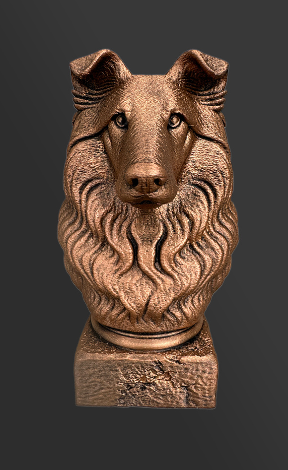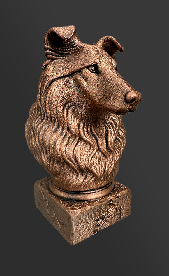 Gebronsd 3D geprint beeldje van een Collie of Lassie want daar bleef ik vroeger voor thuis. Een schotse herdershond is het eigenlijk. Zeer gedetailleerd en erg leuk om te krijgen of te geven. Beeldje is 15 cm hoog.