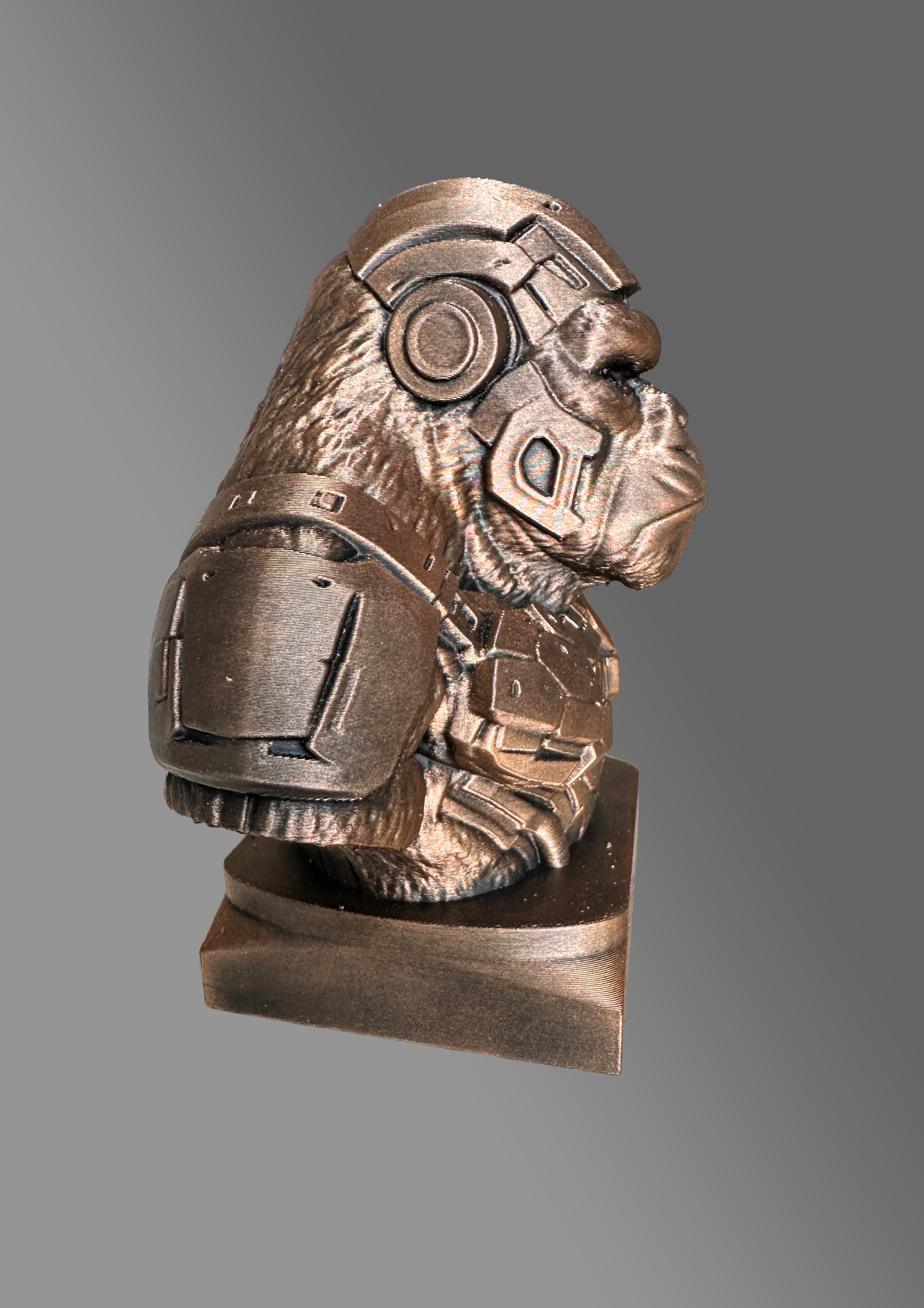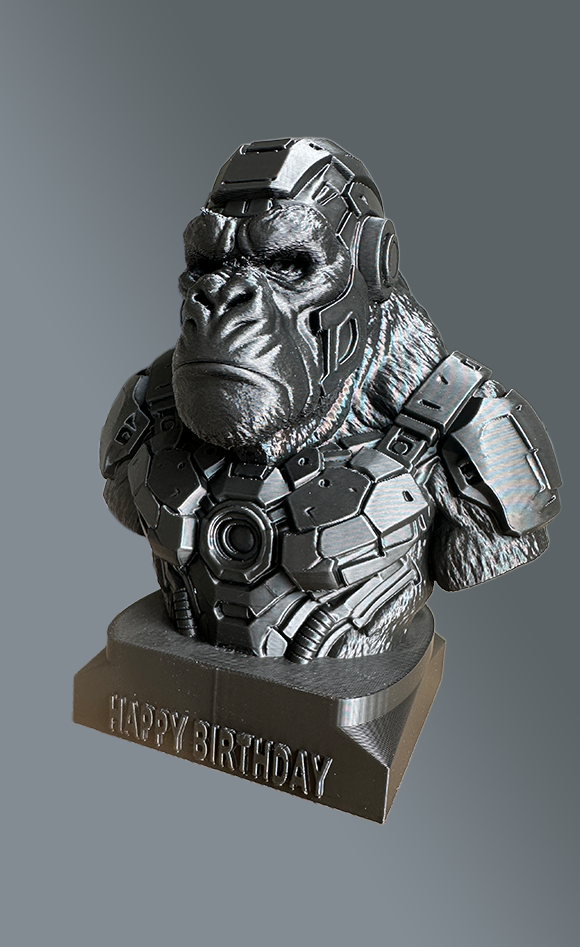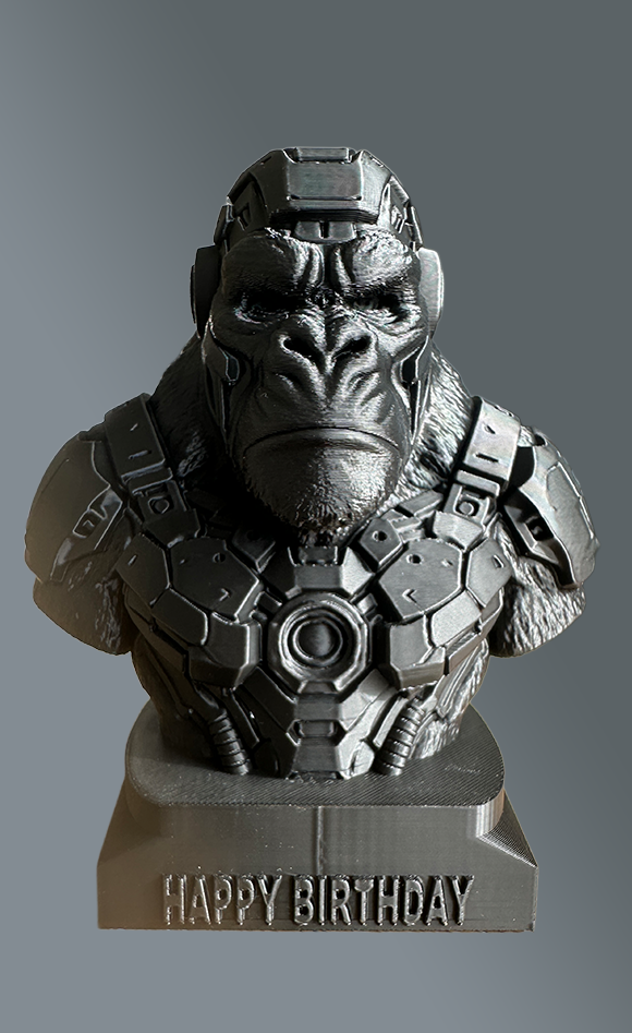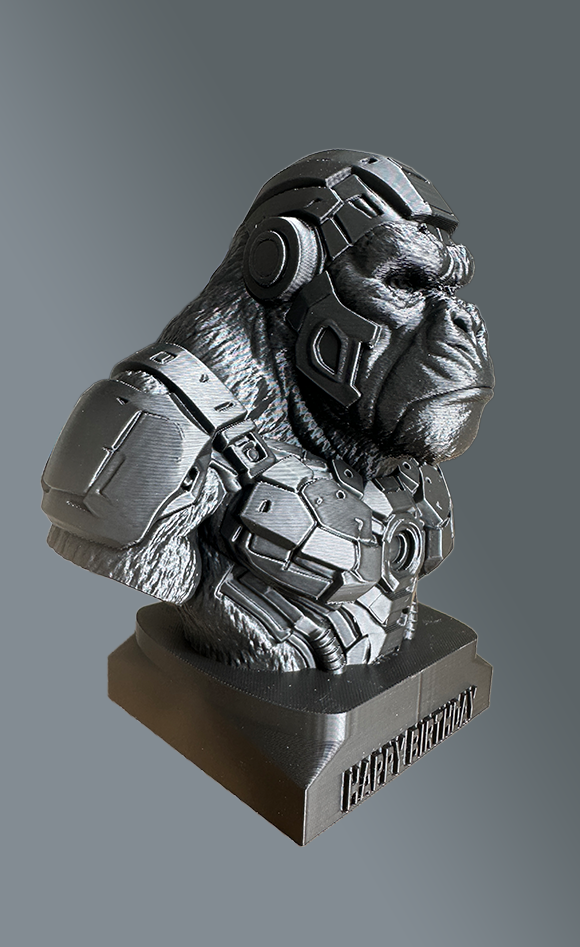 Highres zwart 3D geprint beeldje van Cyber punk Soldier KingKong. 15 cm hoog. Heel stoer en mooi gedetailleerd Kan ook met naam op de voet gepersonaliseerd worden. Elk beeld wordt met zorg en aandacht individueel vervaardigd. Kleine variaties in oppervlak horen bij het ambachtelijke karakter en maken ieder exemplaar uniek.