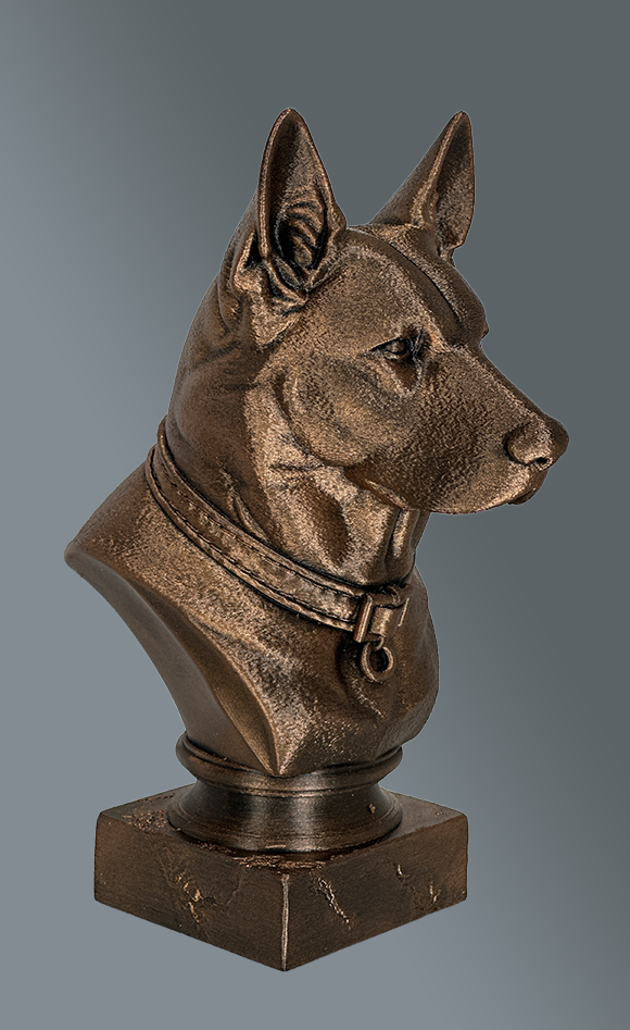 Kunststof gebronsd beeldje van een Duitse Herder Trots en loyaal met halsband 15 cm hoog. Heel mooi gedetailleerd. Gebronsd. Maar kan ook zilver of steen look. Zelfs wit als je zelf wilt kleuren. Kan ook met naam op de voet gepersonaliseerd worden.