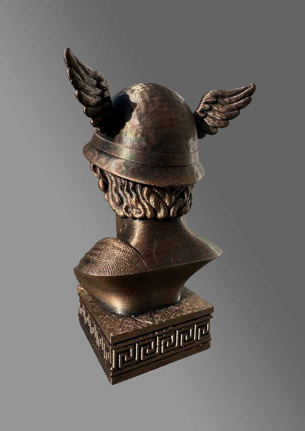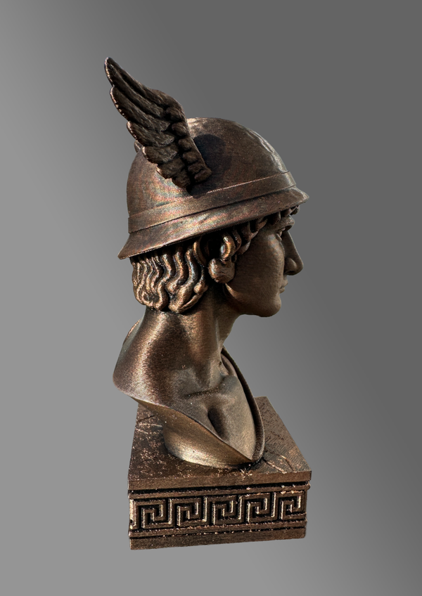 Gedetailleerd beeldje van de Griekse God Hermes de zoon van de oppergod Zeus, uit de griekse mythologie. Eventueel kan met een tekst op de voet gepersonaliseerd worden. Verschillende afwerkingen en hoogtes beschikbaar.