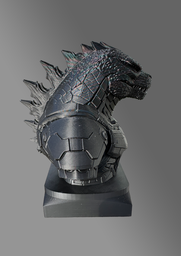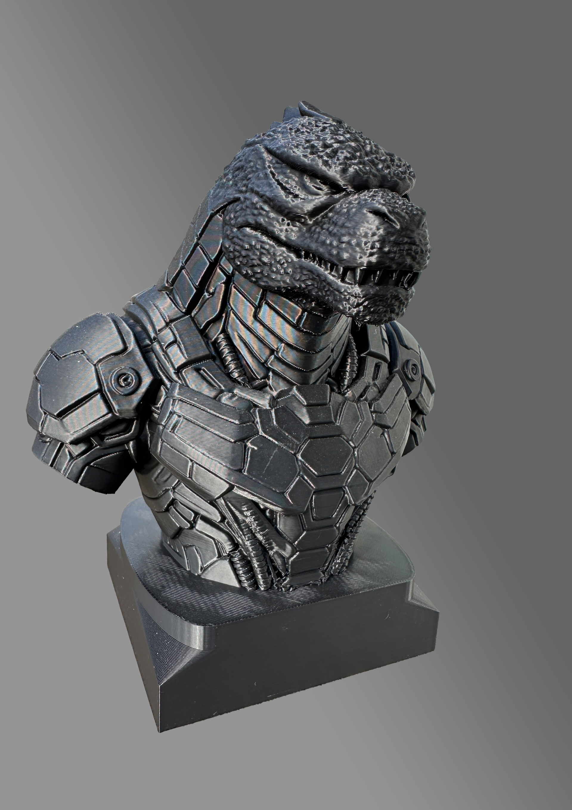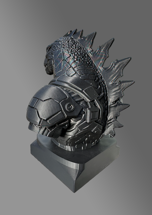 Highres zwart 3D geprint beeldje van Cyber punk Soldier Godzilla. 15 cm hoog. met voet 18 cm en heel dik Heel stoer en mooi gedetailleerd Kan ook met naam op de voet gepersonaliseerd worden. Vergeet u niet het blijft een 3D print hier en daar, meestal uit het zicht, kan er wel een oneffenheidje zitten.