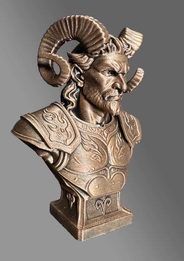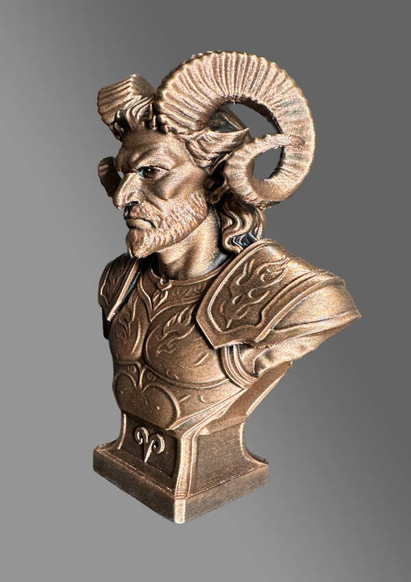 Highres GeBronsd 3D geprint beeldje uit de Zodiac Warrior serie. Sterrenbeeld De Ram 21 Maart t/m 19 April. Heel stoer en mooi gedetailleerd Kan ook met naam op de voet gepersonaliseerd worden. Vergeet u niet het blijft een 3D print hier en daar, meestal uit het zicht, kan er wel een oneffenheidje zitten.