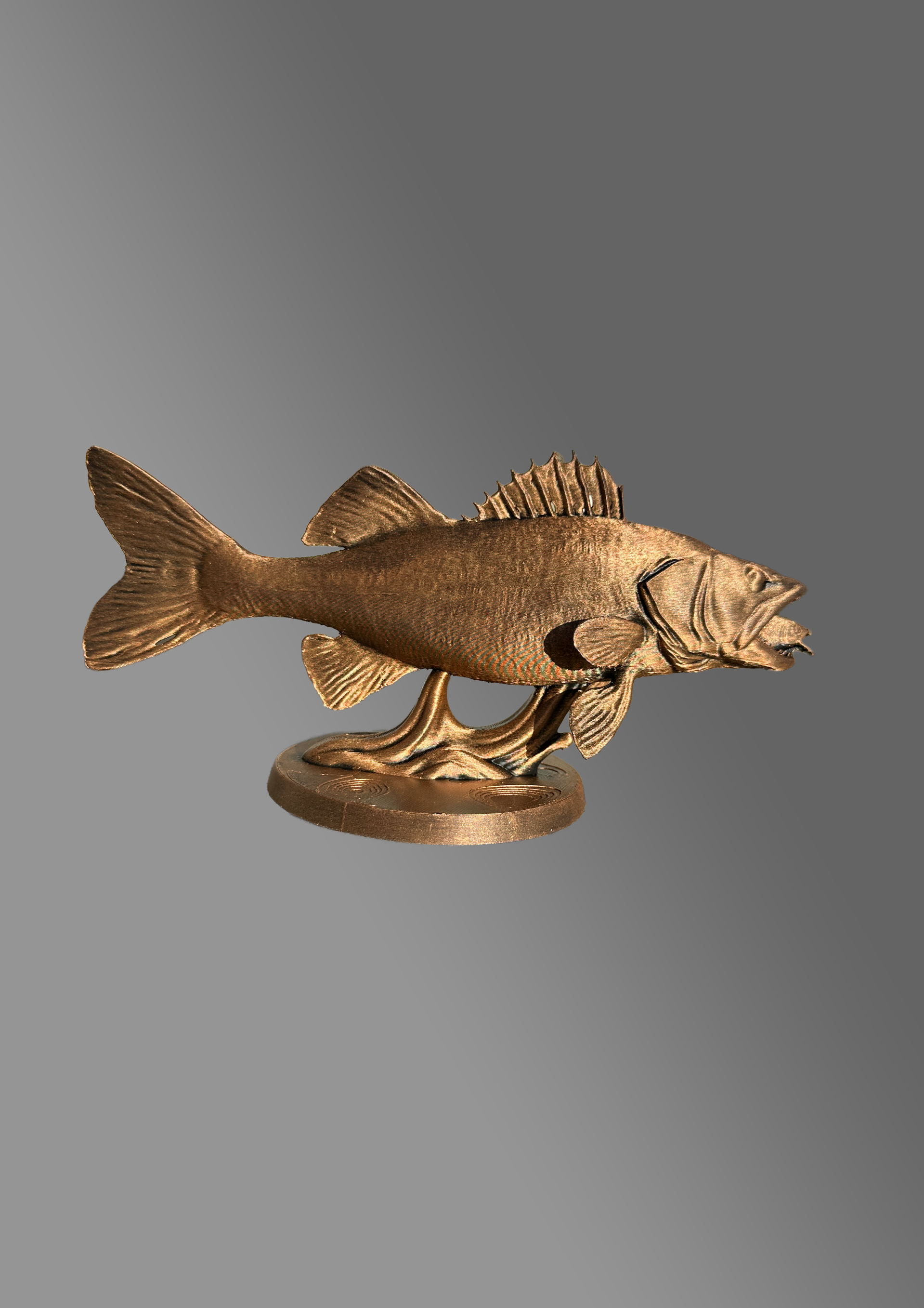 Pracht kado voor een visser en/of als herinnering met datum en gewicht op de voet. Prachtig detail is het kunstaas.