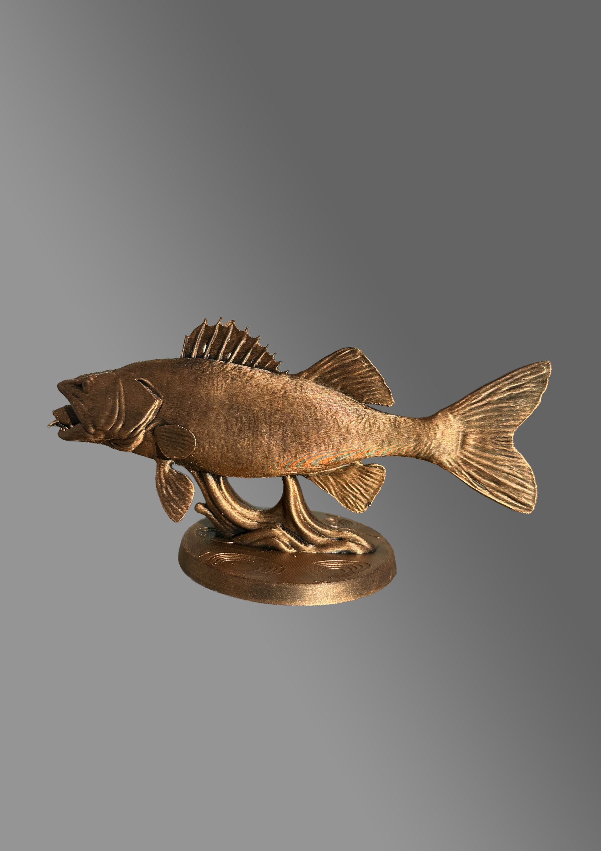 De Snoekbaars met kunstaas in bek 10 cm hoog en 21 cm lang gebronsd
